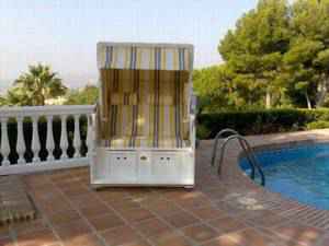 nun endlich ein Foto vom Strandkorb, der sich in Andalusien nun eingewöhnt hat. Wir sitzen gern in ihm und besonders werden wir den Korb im Herbst und im Frühjahr nutzen, wenn die Sonne da, aber der Wind in Bergen frisch ist.