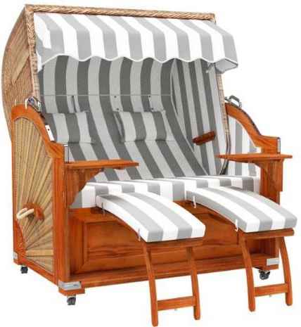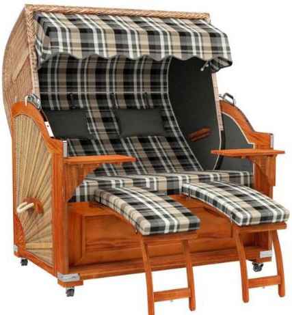 Der Strandkorb „Kampen“ ist das komfortabele Premiummodell und mit 80 Grad Verstellmöglichkeit im Oberkorb ein Ganzlieger.