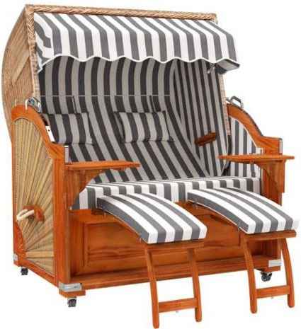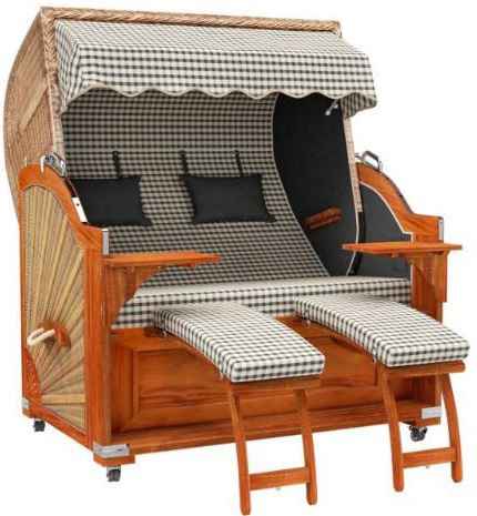 Mit zwei Cocktailtischen, einem Staufach unter der Sitzfläche, einer Handytasche und einem Zeitungsfach bietet dieser Strandkorb viele Extras zu einem unschlagbaren Preis.